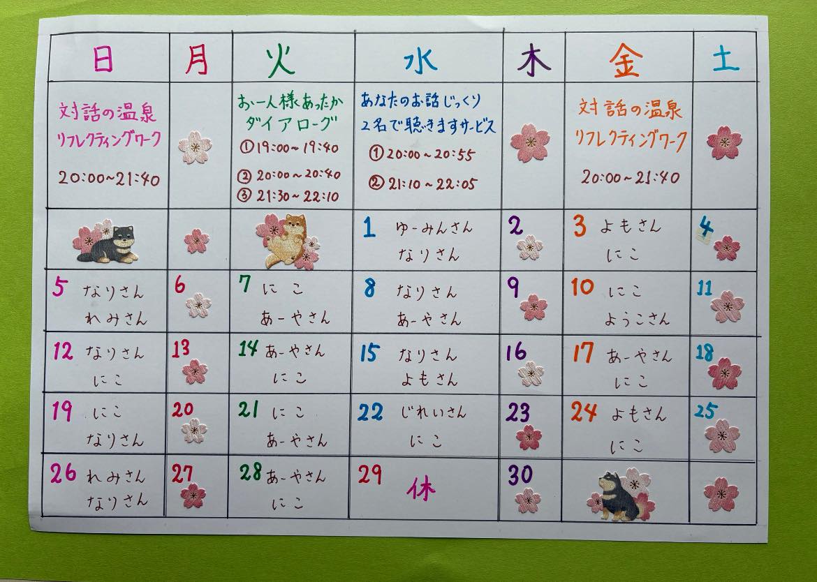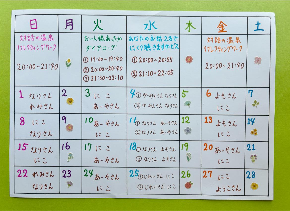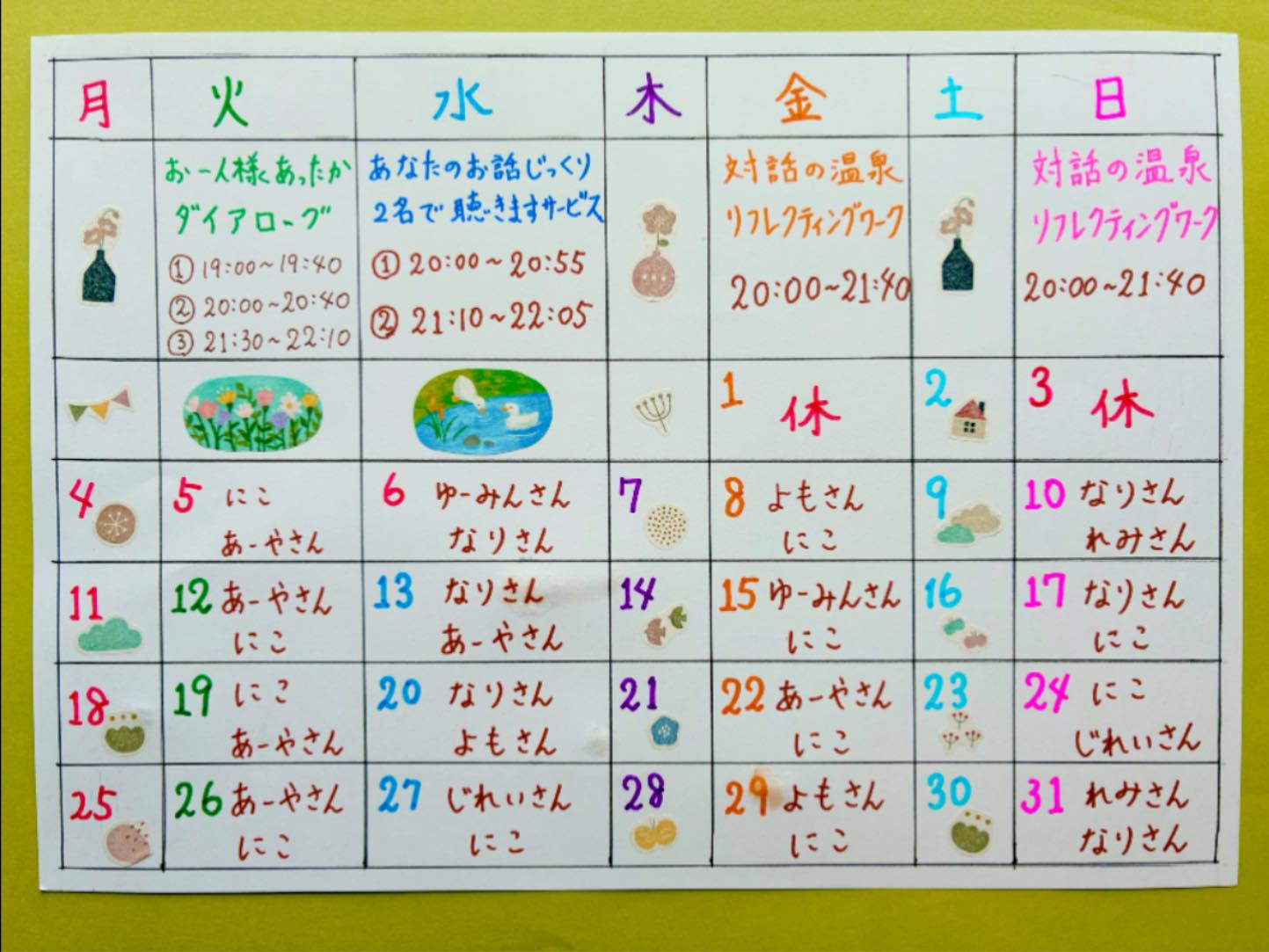 対話を習慣化して、自分や周りへの安心を感じられる場です。オープンダイアローグを参考に、自分の話したことが多様な声の中で響きあう「リフレクティング・ワーク」を金曜日、日曜日の20:00~21:40に開催しています。どうぞ、温かな対話のお湯に浸かりにいらしてください。毎回6人前後の方にご参加いただいています(2024年4月現在)。