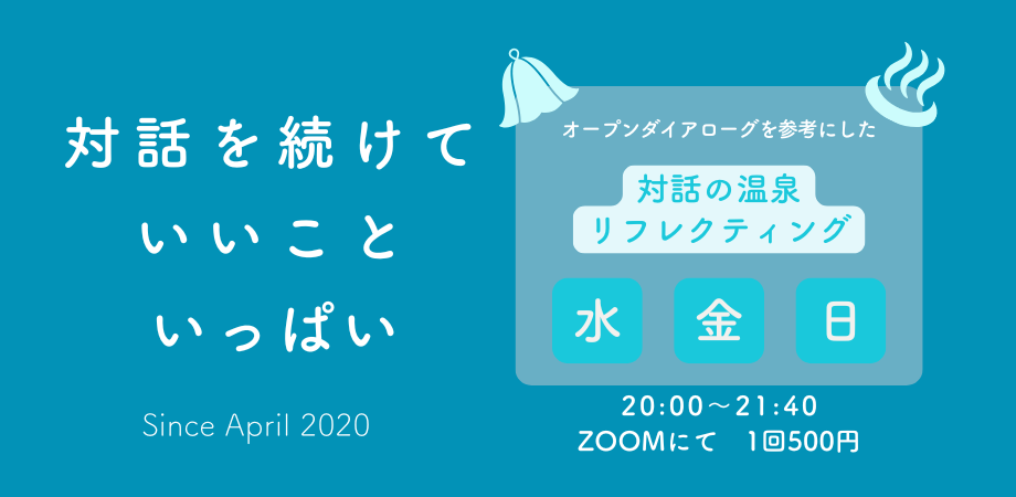 対話を習慣化して、自分や周りへの安心を感じられる場です。オープンダイアローグを参考に、自分の話したことが多様な声の中で響きあう「リフレクティング・ワーク」を水曜日、金曜日、日曜日の20:00~21:40に開催しています。どうぞ、温かな対話のお湯に浸かりにいらしてください。毎回6人前後の方にご参加いただいています(2024年4月現在)。