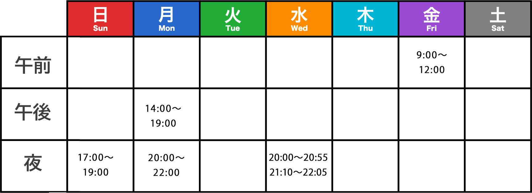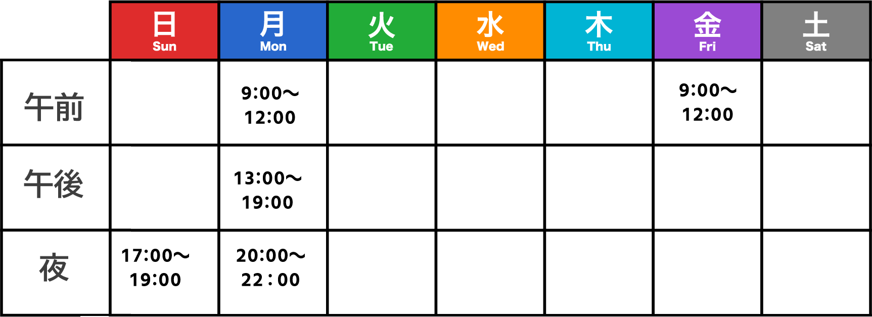 ※可能な限り、9:00~9:55、20:00~20:55など区切りのいい時間で実施できればと思っております。